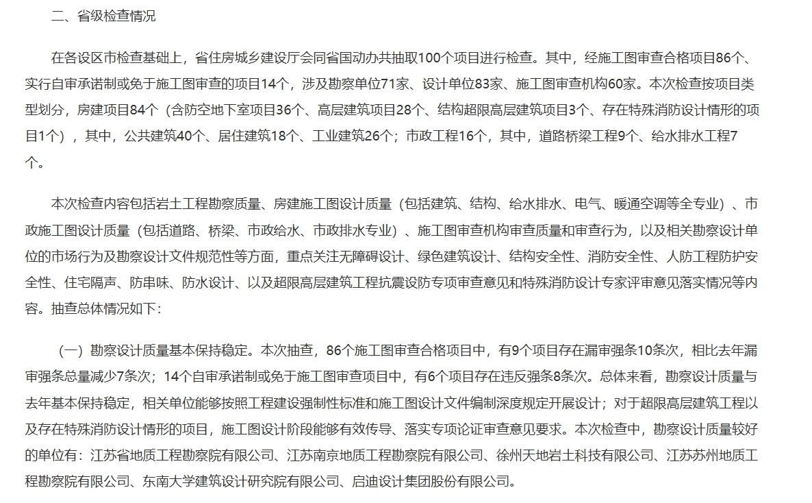 2025年12月31日,江苏省住房和城乡建设厅官网发布省住房城乡建设厅、省国防动员办公室《关于2025年度工程勘察设计质量及市场行为联合抽查情况的通报》,我院凭借出众的专业素养在联合抽查中表现突出,勘察设计质量被认定为质量较好单位,获得通报表扬。